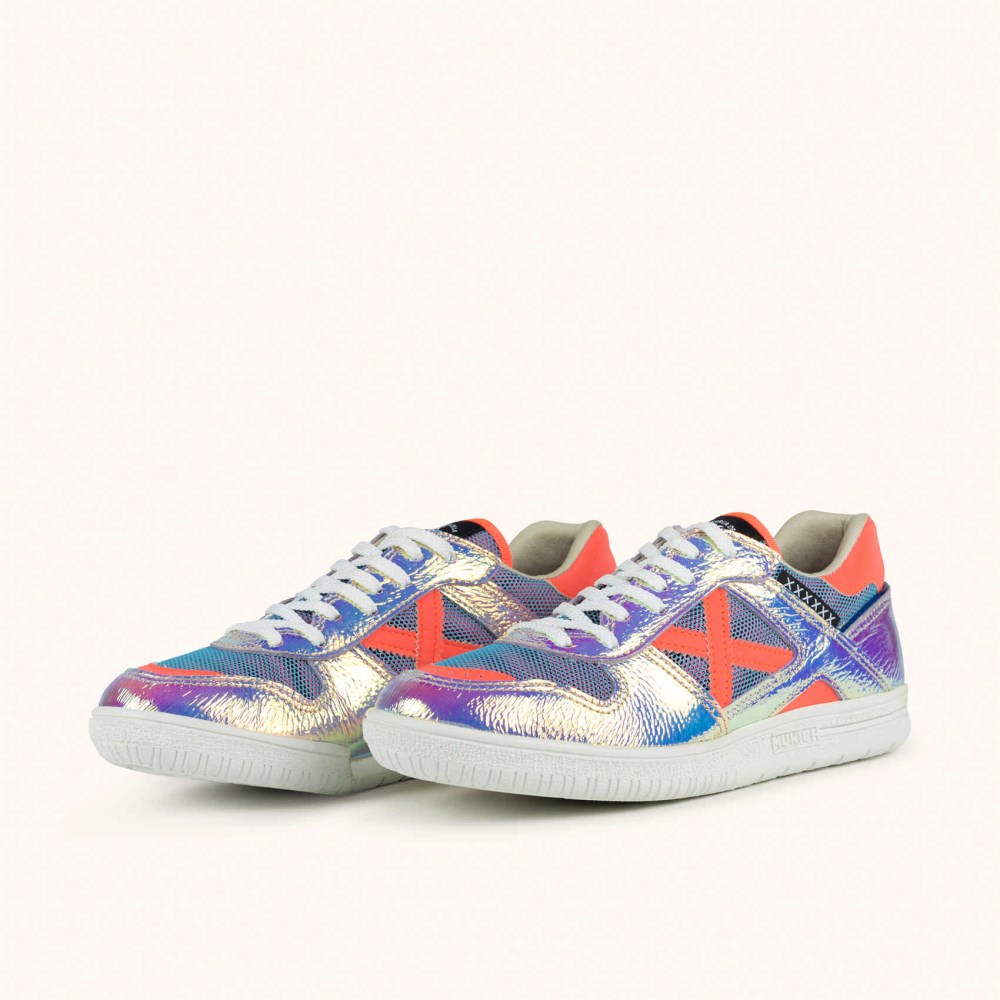 El mítico modelo Continental que nace de las pistas de futbol sala. El material iridiscente toma protagonismo en una combinación de colores con efectos psicodélicos. Incorporamos una rejilla técnica efecto tornasol que juega dando profundidad y una estética muy atrevida. Los toques en coral neón, aportan un toque de color en una combinación caleidoscópica.