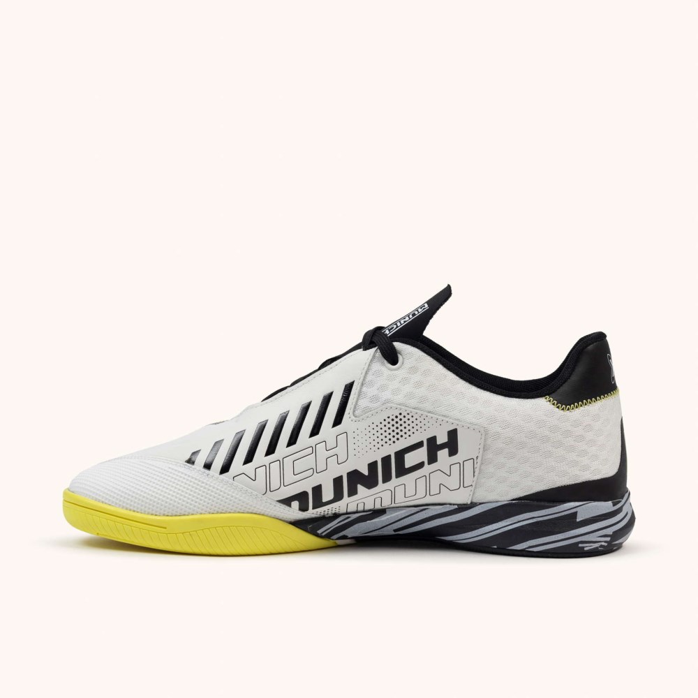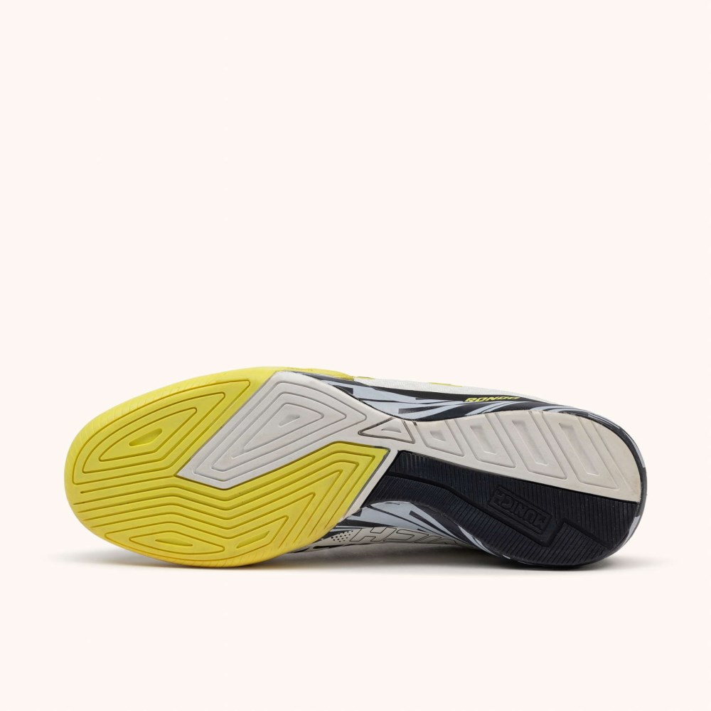 Un diseño futurista que cuenta con las mejores prestaciones para el juego indoor. La zona frontal se compone por un soft PU, reforzado con una pieza de goma termosellada y con textura en puntera para resistir mejor los roces de la pelota. La zona lateral y posterior se componen de un mesh para aligerar el peso de la zapatilla y mejorar la transpiración, acompañado de detalles estéticos termosellados. Forro de tejido para un mejor ajuste y una cómoda sensación al llevarlas puestas. La RONDO es perfecta para profesionales y amateurs, ya que cumple con todas las prestaciones necesarias para convertirse en el rey de la pista. . Media suela de perfil bajo de phylon y suela de goma tricolor.
